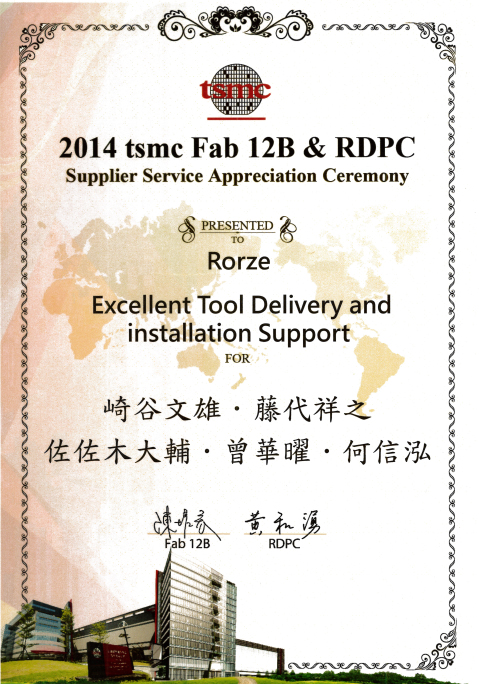 RORZE Technology INC. awarded the 2014 TSMC Fab 12B & RDPC award for excellent service provider