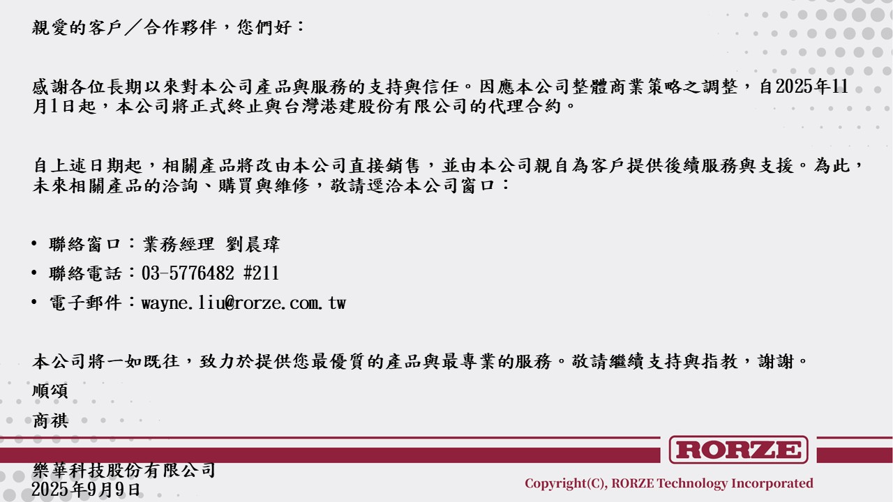 感謝各位長期以來對本公司產品與服務的支持與信任。因應本公司整體商業策略之調整,自2025年11月1日起,本公司將正式終止與台灣港建股份有限公司的代理合約。